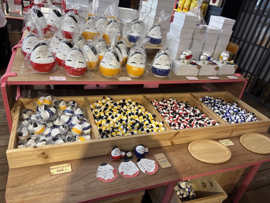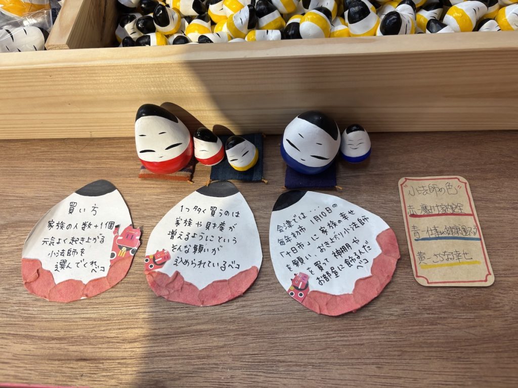 赤べこ同様、会津を代表する郷土玩具の起き上がり小法師も購入可能。説明にあるように筆者も家族の人数より1個多い起き上がり小法師をお土産に購入した。