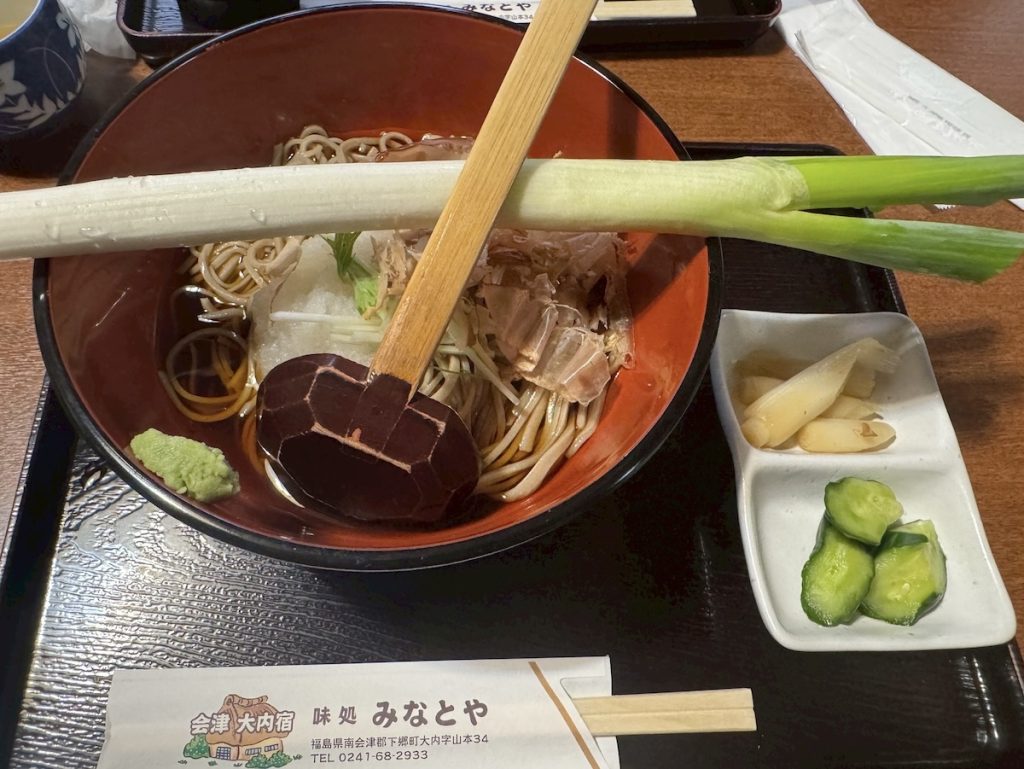 大内宿の名物である「ねぎそば」を味処 みなとやでいただいた。ねぎ丸ごと1本を箸代わりに食べるという「ねぎそば」。大内宿に訪れた方は、ぜひ豪快にねぎでそばを食べてみてほしい。