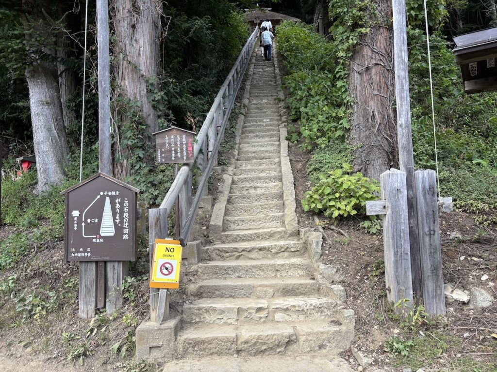 歩き進むと突き当りには、大内宿見晴台がある。急な石段を頑張って登り、大内宿を見渡せるスポットに到着。