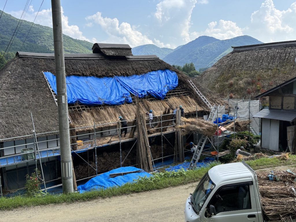 見晴台からの帰り道、タイミング良く屋根の葺き替え作業も見ることができた。茅葺き屋根の材料はススキだそうだ。普段では見ることができない貴重な光景だった。
