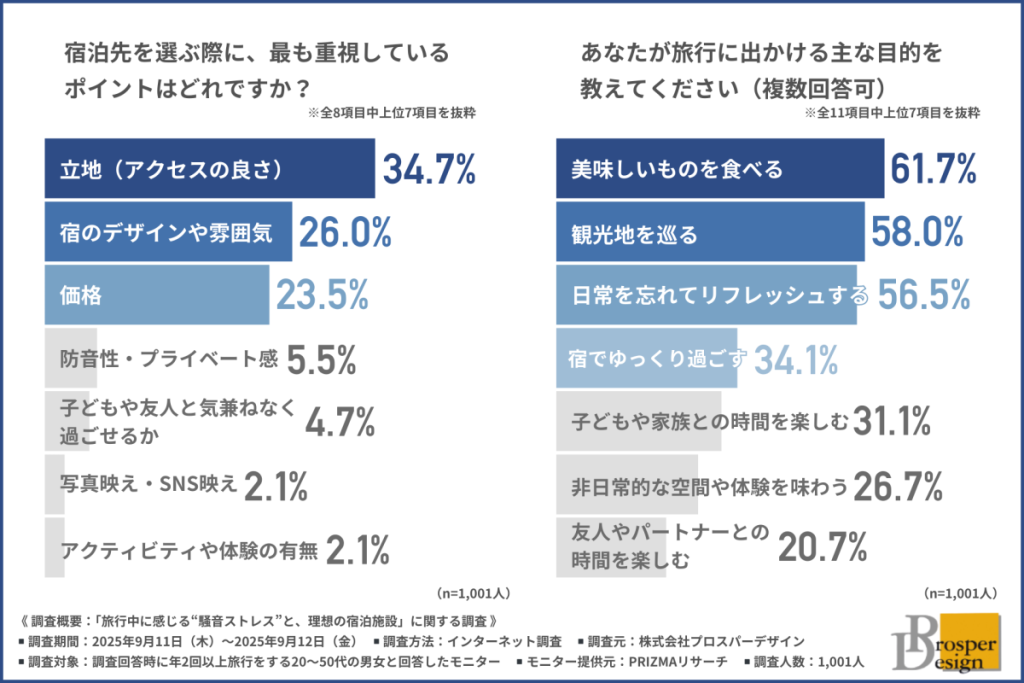 次に、宿泊施設自体の選び方と、滞在に求められる価値観の変化に目を向ける。調査では、宿を選ぶ際に最も重視するポイントとして「立地(アクセスが良い)」(34.7%)、「宿のデザイン・雰囲気」(26.0%)、「価格」(23.5%)が上位となっている。また、旅行の主な目的として「美味しいものを食べる」(61.7%)、「観光地を巡る」(58.0%)、「日常を忘れてリフレッシュ」(56.5%)といった項目が並ぶ。