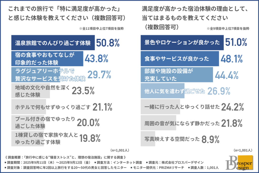 旅先で「特に満足度が高かった」と感じる体験としては、「温泉旅館でのんびり過ごす体験」が50.8%で最多、「宿の食事やおもてなしが印象的だった体験」が43.8%、「ラグジュアリーホテルで贅沢なサービスを受けた体験」が29.7%という結果だった。また、「満足度が高かった宿泊体験の理由」では、「景色やロケーションが良かった」(51.0%)、「食事やサービスが良かった」(48.1%)、「部屋や施設の設備が充実していた」(44.4%)が上位に挙がった。そして、「他人に気を遣わず過ごせた」(26.9%)、「周囲の音が気にならず静かだった」(21.8%)という“静けさ・配慮不要の空間”を満足の要因に挙げる人も少なくない。