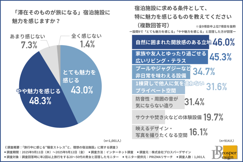 また、「“滞在そのものが旅になる”宿泊施設」に魅力を感じるかという問いには、43.0%が「とても魅力を感じる」、48.3%が「やや魅力を感じる」と回答しており、合計で91%以上が滞在そのものに価値を見出している。さらに、そのような施設に求める条件として「自然に囲まれた開放感のある立地」(46.0%)、「家族や友人とゆったり過ごせる広いリビング・テラス」(45.3%)、「プールやジャグジーなど非日常を味わえる設備」(34.7%)が上位にあげられている。