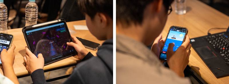 使用されたDreamCoreは、テキスト指示(プロンプト)を入力することで、誰でも簡単にゲームの骨格や挙動を生成できるというツール。参加者はまず、「どんなゲームが作りたいか」を親子で話し合い、次にそのアイデアをAIに伝えるための言葉を探しました。ツール操作自体はシンプルで、プログラミングの知識がなくても手が動かせる設計になっていたため、子どもたちは保護者や講師のサポートを受けながら、自らゲーム画面や操作設定を編集していました。完成後には、参加者同士で作品をプレイしあい、作品の良さや工夫点を互いに共有する時間も設けられていました。
