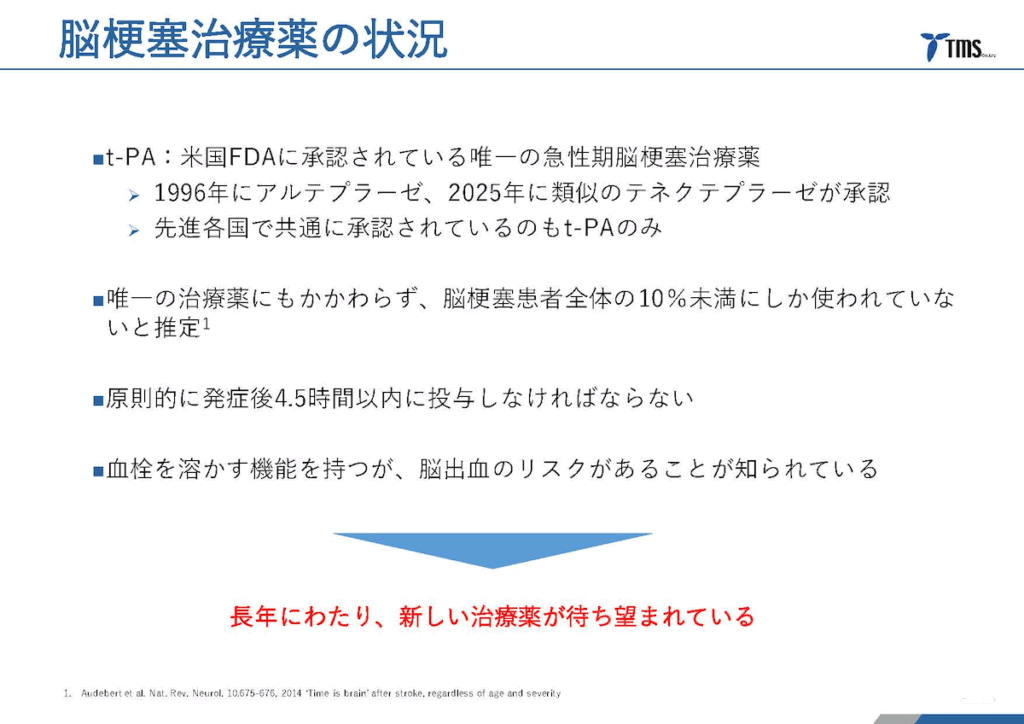 現在の標準的な治療薬「t-PA」は、発症後4.5時間以内に投与しなければならず、脳出血のリスクもあるため、実際に投与できる患者は全体の10%未満にとどまっています。この「時間の壁」と「安全性の課題」を乗り越える新たな選択肢として期待されているのが、ティムスが開発する「TMS-007」です。本説明会の内容を詳しくレポートします。