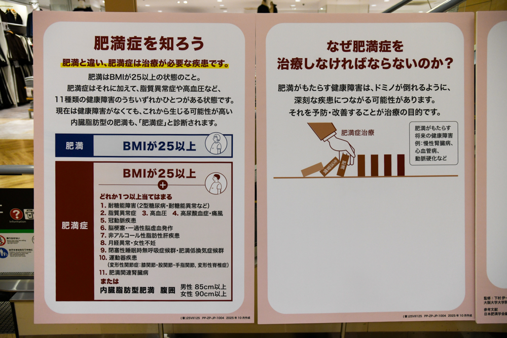 なお、肥満というと食生活の乱れや運動不足など不摂生が原因であると本人だけでなく周囲も先入観を抱きがちだが、展示を案内してくれたスタッフによると「肥満には遺伝や代謝など自らではコントロールできない点やストレスなどのさまざまな要因があり、運動をしたり、食事の内容を変えるだけでは体重を落とせない方もいます」とのこと。さらに「『肥満を直すために病院に行くのは恥ずかしい』と感じている方は多いかもしれませんが、まずは医師に相談していただきたいです。」と同氏は語る。