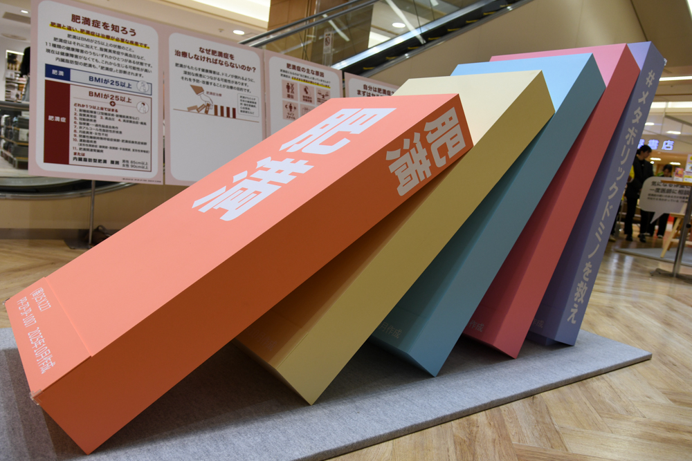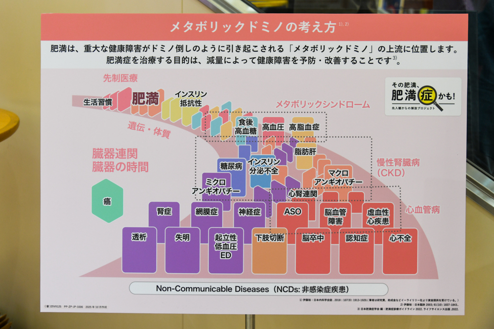 多くの人が行きかうイオンモールの一角で行われたイベントの入り口には、「メタボリックドミノ」を立体表現したオブジェが鎮座。今にも倒れそうなドミノは、肥満を“上流”として高血圧や高脂血症などのメタボリックシンドローム、糖尿病や脂肪肝などの慢性腎臓病、脳血管障害や虚血性心疾患、さらには失明、脳卒中、心不全へと”下流”に進むごと重大疾患に発展していく肥満症の怖さを表したもので、そのカラフルな見た目に反して恐ろしい意味を含んでいる。