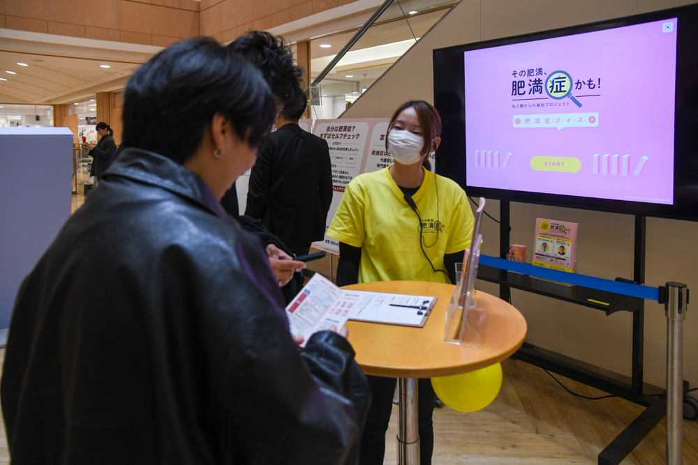 場内では肥満症の基本的な知識を分かりやすく伝える展示のほか、肥満症のセルフチェックや○×クイズを実施。「肥満症を知ろう」「なぜ肥満症を治療しなければならないのか?」「肥満症の主な原因」などを紹介した展示パネルの前には、真剣な表情で解説を読む中高年の男性、ベビーカーを押す親子連れ、オブジェと記念写真を撮りながら回る若いカップルなど、さまざまな表情で肥満症を学ぶ人々の姿が見られた。