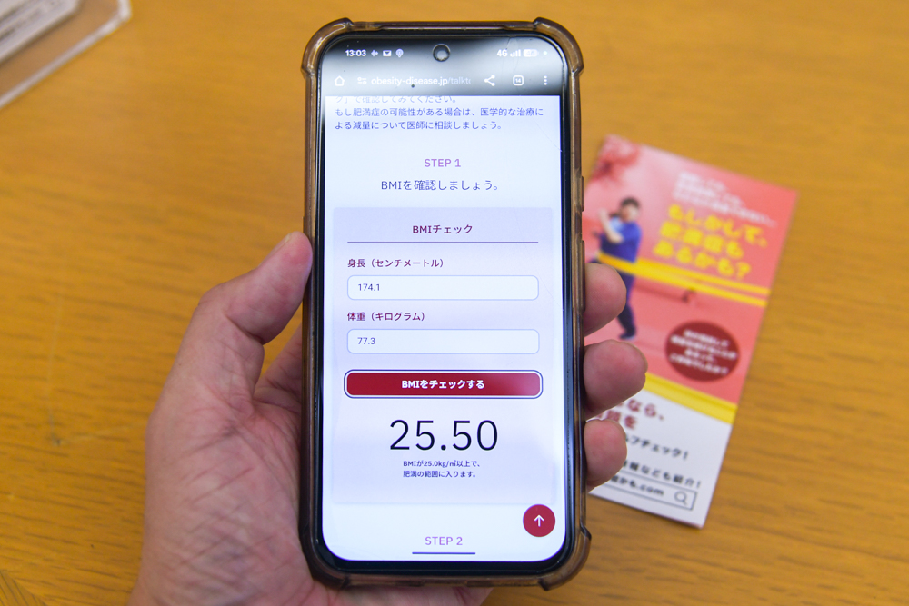 ちなみに私も会場の身長計と体重計を使って自分のBMIを測定してみることに。実は体重計に乗るのはしばらくぶり。なおかつ、ここ数日、とんかつ、唐揚げ、ステーキ、ラーメンとややヘビーな食事が続いていたため、やや不安を感じながら測ってみると、77.3キロという数字が。そして174センチの身長とともにチェック画面を入力すると、出てきたBMIは25.5…。