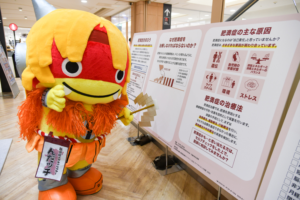 会場には、秋田県PRキャラクター「んだッチ」も登場し、来場の呼びかけをお手伝い。まだ子どもなので肥満症を気にするには早い年齢だが、場内の展示をしっかり鑑賞し、健康の大切さについて学べた様子だった。