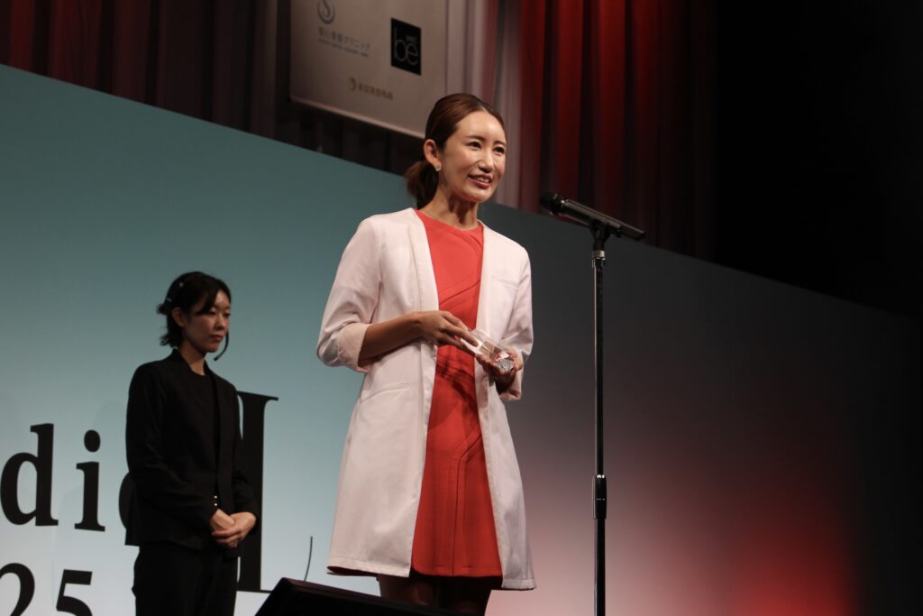 井上真梨子先生は、「大好きな脂肪豊胸で素敵な賞を頂き、光栄に思っています。これからも皆さんの理想とするバストを作れるよう頑張っていきますので、よろしくお願いします」と語りました。