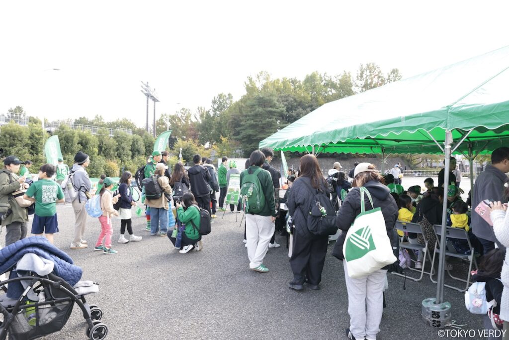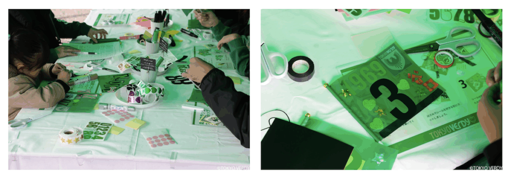 「応援フラッグワークショップ」は、開始早々から長蛇の列ができるほどの人気ぶりでした。先着250名限定ということで、子どもからシニア層まで、幅広い世代が参加。思い思いのデザインや文字で、世界にひとつだけのオリジナル応援フラッグを作りました。完成したフラッグを持ってスタジアムに向かう参加者たちの姿は、年齢を問わず東京ヴェルディを応援する気持ちがひとつになった象徴のようでした。風に揺れる手作りのフラッグが、会場全体を温かな空気で包んでいました。