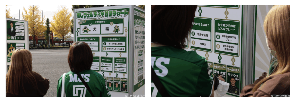 発見ブース」。選手たちのプロフィールやマイブーム、ファンへのメッセージが紹介された特設パネルには、多くの来場者が集まりました。自分の「推し選手」を探しながら楽しめる「推しヴェルディ診断チャート」も好評で、友達同士で参加し、診断結果に盛り上がる様子や、選手に関する新たな発見にワクワクした様子が見受けられました。