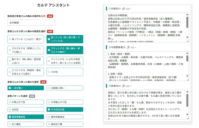 症状分析アシスタントは、こうした現場の悩みに寄り添うように設計されています。痛みの場所や姿勢のパターンを選ぶだけで、AIが施術の方向性や考え方を提示してくれるため、経験が浅いスタッフでも判断の拠りどころを持てるようになります。あくまで提案であり、判断を代替するものではありませんが、施術の流れを理解するうえでの“道しるべ”として活用できる印象です。