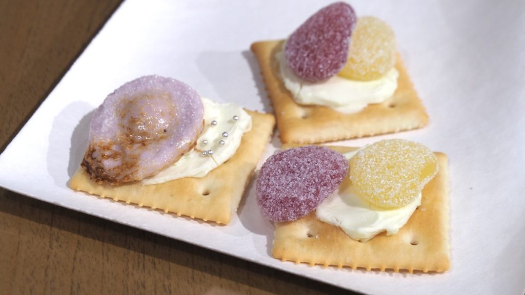 また、「グミクラッカー」は、クラッカーの上にクリームチーズとグミを乗せたカナッペ風の一品。「マロッシュ」を乗せたものはオーブンで軽く温められており、普段のモチッとした食感から、加熱によってトロッとした食感へと変化する驚きも楽しめる。