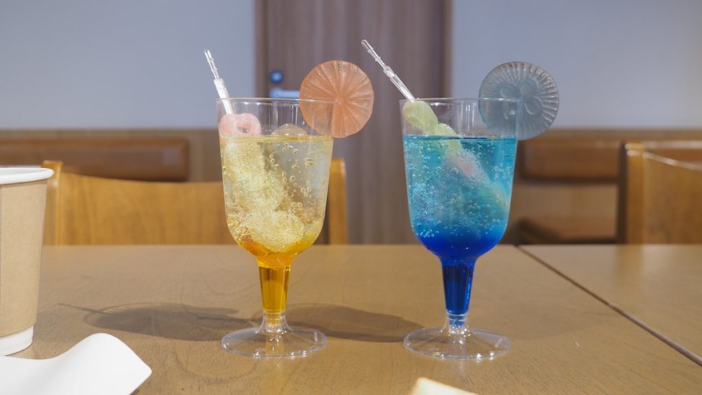 ドリンクメニューで目を引いたのは「グミソーダ」だ。ブルーハワイやマンゴー味のソーダに、クラゲの形をした大きな「シークラゲグミ」が乗っており、マドラーには「ピュレグミ」などが刺さっているというインパクト抜群の見た目。マドラーのグミは少し硬めの「カンデミーナ」などが使われており、ソーダに浸しながら食べる楽しさも提案されていた。そのほかにも、これからの季節に嬉しい「ホットのど飴ティー」も提供され、キャンディの新たな可能性を感じさせるラインナップとなっていた。