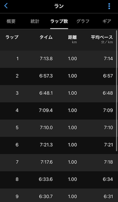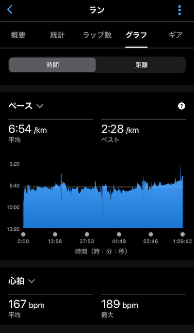 怪我に怯えながらも気力を振り絞り、結果1時間10分(1km7分ペース)を切る、1時間9分42秒で無事ゴール。