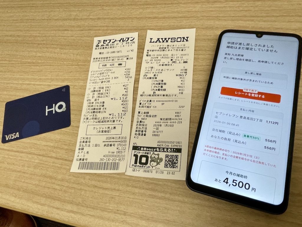『食事補助HQ』の使い方はとてもシンプル。社員は「HQカード」で決済後、レシートをスマートフォンで撮影・アップロードし、補助申請の手続きを行う。