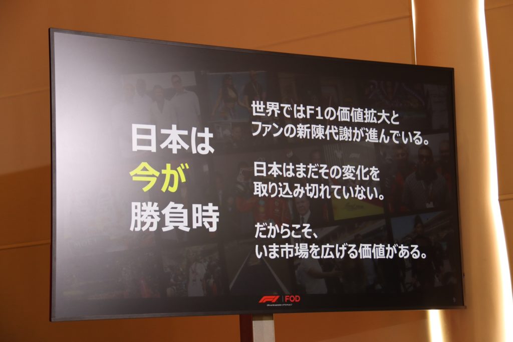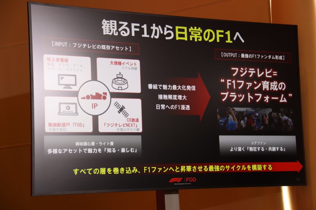 「私たちは、フジテレビの持っている地上波・配信・CS放送、そしてイベントなどのアセットを活用し、観るF1から日常のF1へと浸透させていきたい。月曜日の朝にF1が会話に上るような、記憶に残るものにしていきたいと考えています。」