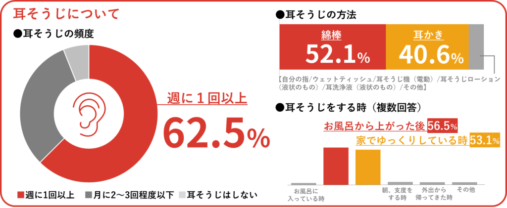 耳そうじの頻度については、62.5%が週1回以上実施。耳そうじの方法は「綿棒」52.1%、「耳かき」40.6%。タイミングは複数回答で「お風呂から上がった後」56.5%、「家でゆっくりしている時」53.1%と、多くの人が日常的に耳そうじを行っており、綿棒や耳かきを使用していることが分かります。