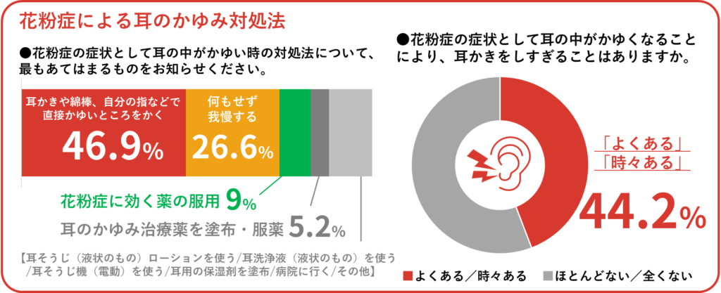 花粉症の症状として耳の中がかゆい時の対処法では、「耳かきや綿棒、自分の指などで直接かゆいところをかく」が 46.9%と最多。一方、治療薬を使用する人は少なく、「花粉症の症状に効く薬の服用」9.0%、「耳のかゆみ治療薬を塗布」4.2%、「耳のかゆみ治療薬を服薬」1.0%と、症状に合った対処を行う人は少数となりました。