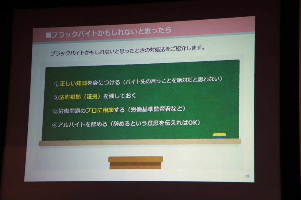 働く前に知るべき法知識や、ブラックバイト・闇バイトなどについての注意喚起が行われました。