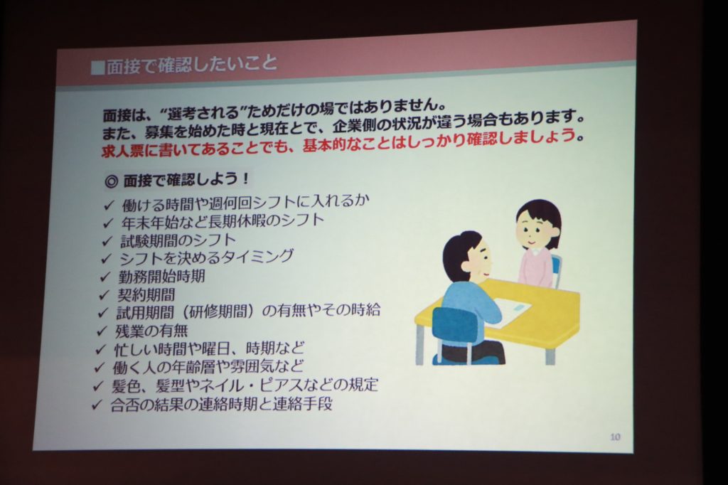 また新入生たちに向けて「時給が相場と大きく違わないかを確認する」「求人票をスクリーンショットなどで忘れず保存しておくこと」などのアドバイスを送りました。