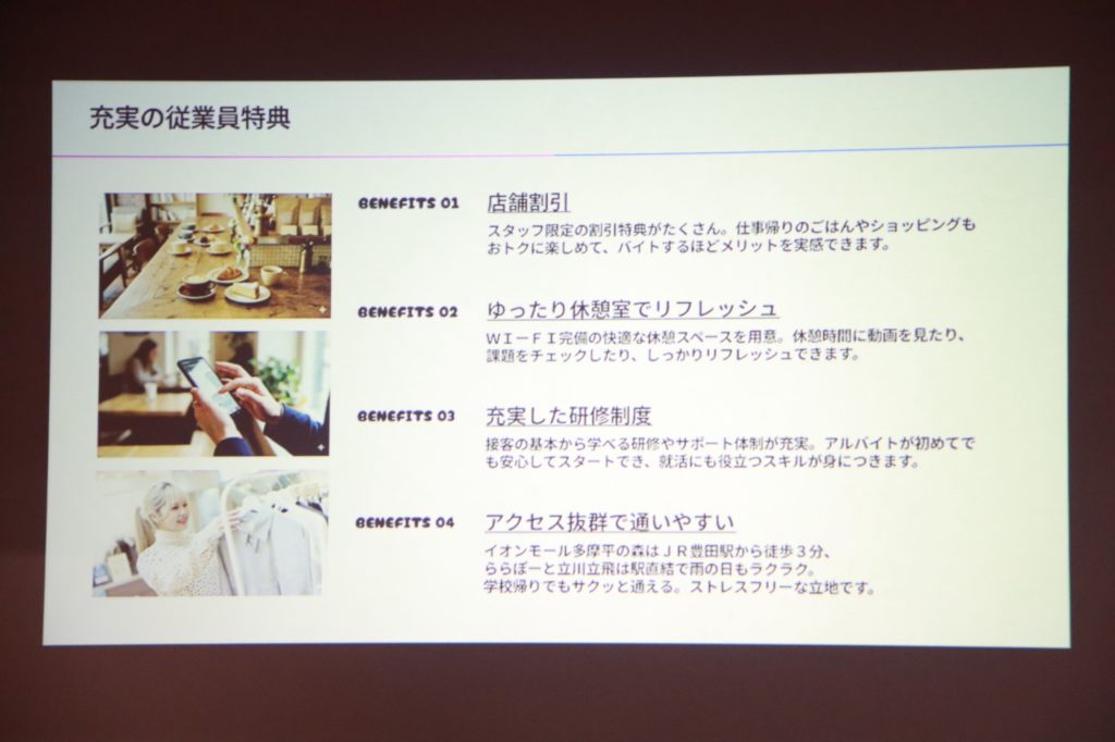 他にもスキルアップのための資格試験の用意や、SCによってトイレなどの環境整備が整っている点も、路面店舗にはない魅力だと訴えかけました。