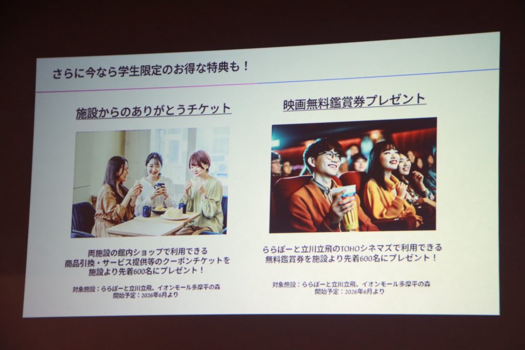 また、今回のプロジェクトの一環として、学生同士のコミュニティ形成の支援の一環で、学生従業員のみの交流会の開催や、学生生活支援のための「施設からのありがとうチケット」として、両施設で利用可能な学生限定のクーポン券やTOHOシネマズ無料鑑賞券の配布なども実施することを紹介。
