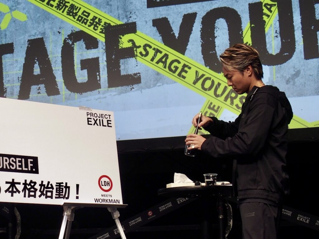 そして見事な達筆でブランド名『ZERO-STAGE』を書き上げました。TAKAHIROさんは、「一生懸命心を持ってこう作品作りをする中で、自分たちの作品をお届けした先の皆さんのものになってほしいなという思いがある。長く活動していると、いろんな方々から楽曲にこんな思い出があるとか、卒業式で歌ったとか、結婚式で流したとか、いろんな皆さんの人生の岐路で僕たちの楽曲を聴いていただけたり、歌っていただけたりして、皆さんの手元で僕たちが作ったものが育っているんだなという気がしている。今回携わったウェア1つ1つも、自分たちで企画して作っていながらも、皆さんの手元に届いて、そして皆さんのものになって、皆さんの人生を輝かせてくれるものになるっていう意味で「STAGE YOURSELF.」このタイトルの通りだなと思う。今後とも、アーティスト業はもちろん、携わらせていただける以上、本当に気持ちを込めて1着1着作っていきたい」と語りました。