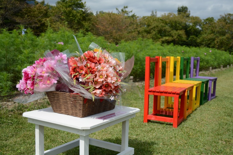 花を鑑賞するだけでなく、摘み取り体験に参加できるのもこのイベントならではの魅力です。9月末にはキバナコスモス、10月中旬にはコスモスの摘み取りが行われ、自分の手で季節の花を持ち帰ることができます。また、「文字オブジェ」や「風景の扉」といったフォトスポットも設けられており、写真を撮りながら散策する楽しみも広がります。