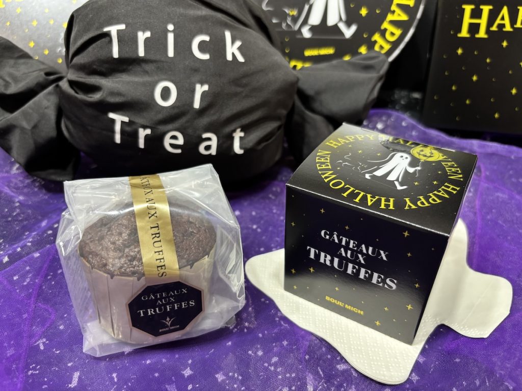 世界食品コンテスト モンド・セレクション25年連続金賞受賞。濃厚なショコラ生地にトリュフ・オ・ショコラが贅沢にもまるごと一粒入ったトリュフケーキ。ブールミッシュの看板商品でもあるトリュフケーキが、今年は黒×ゴールドのハロウィン限定パッケージとなって登場。