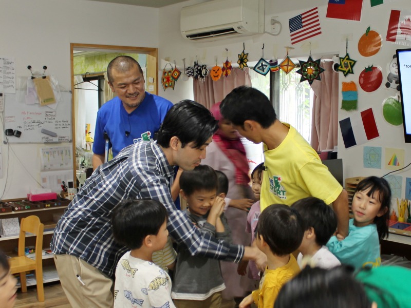 都内の保育園で行われた“英語の先生”体験では、おなじみの茨城弁を封印し、オールイングリッシュで授業に挑みます。